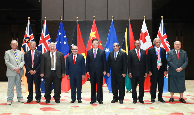 11月16日,国家主席习近平在莫尔兹比港同巴布亚新几内亚总理奥尼尔、密克罗尼西亚联邦总统克里斯琴、萨摩亚总理图伊拉埃帕、瓦努阿图总理萨尔瓦伊、库克群岛总理普纳、汤加首相波希瓦、纽埃总理塔拉吉等建交太平洋岛国领导人以及斐济政府代表、国防部长昆布安博拉举行集体会晤。习近平主持会晤并发表主旨讲话。