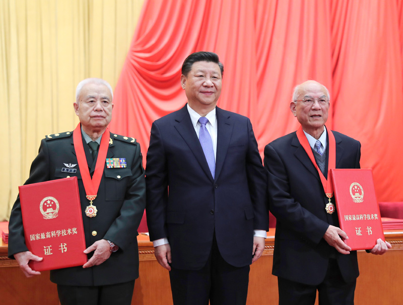 1月8日,2018年度国家科学技术奖励大会在北京人民大会堂隆重举行。中共中央总书记、国家主席、中央军委主席习近平向获得2018年度国家最高科学技术奖的哈尔滨工业大学刘永坦院士(右)和中国人民解放军陆军工程大学钱七虎院士(左)颁奖。
