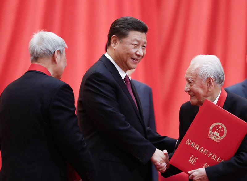 1月10日,2019年度国家科学技术奖励大会在北京人民大会堂隆重举行。这是习近平等党和国家领导人同获得2019年度国家最高科学技术奖的原中国船舶重工集团公司第七一九研究所黄旭华院士和中国科学院大气物理研究所曾庆存院士一道,为获得国家自然科学奖、国家技术发明奖、国家科学技术进步奖和中华人民共和国国际科学技术合作奖的代表颁发证书。